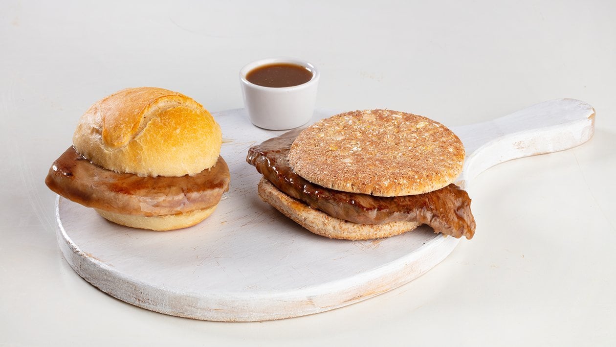 • Cortar o bolo do caco ao meio e colocar o bife.
