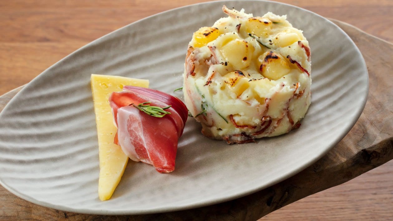 • Envolver os ingredientes com a base de puré de batata quente e colocar em aro metálico, levando ao forno ou salamandra a gratinar.