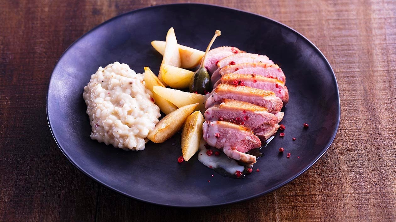 • Servir o Magret laminado juntamente com o Risotto e a Pêra caramelizada.