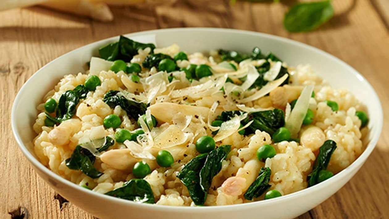 • 5 minutos antes do arroz cozinhar, acrescentar as ervilhas, os espinafres e os espargos brancos;