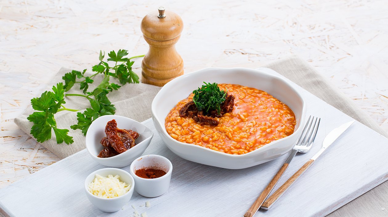• Adicionar 300ml de Knorr molho desidratado Tomate preparado ao arroz até estar cozinhado. Acrescentar knorr primerba pesto vermelho.