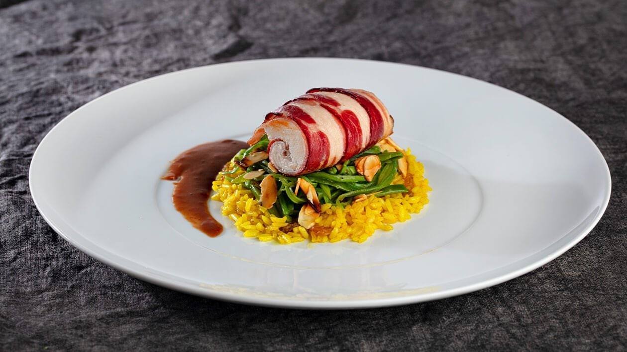 • Por cima a rúcula temperada e no final o rolinho de frango com bacon.