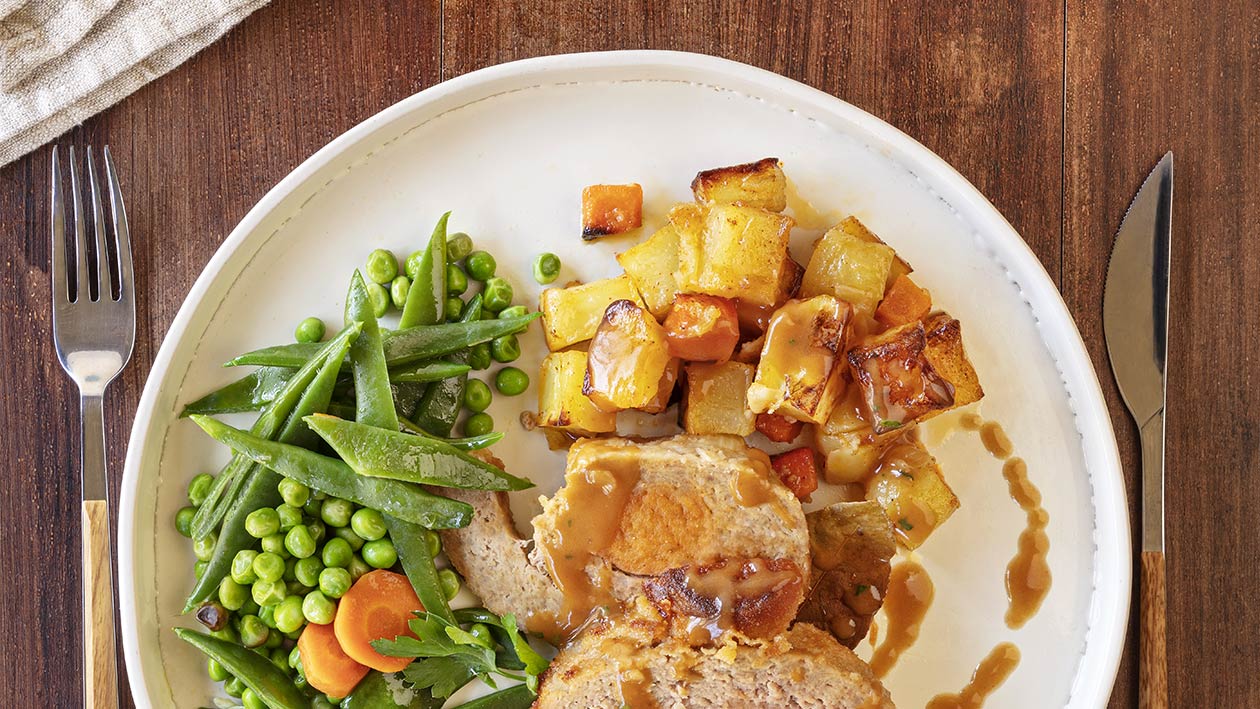 • Servir o rolo fatiado com as batatas assadas e os legumes salteados.