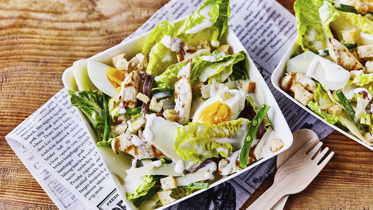 • Empratar a salada e por cima colocar ovo, croutons, feijões, lascas de parmesão, anchovas, frango, agrião e algum molho extra.