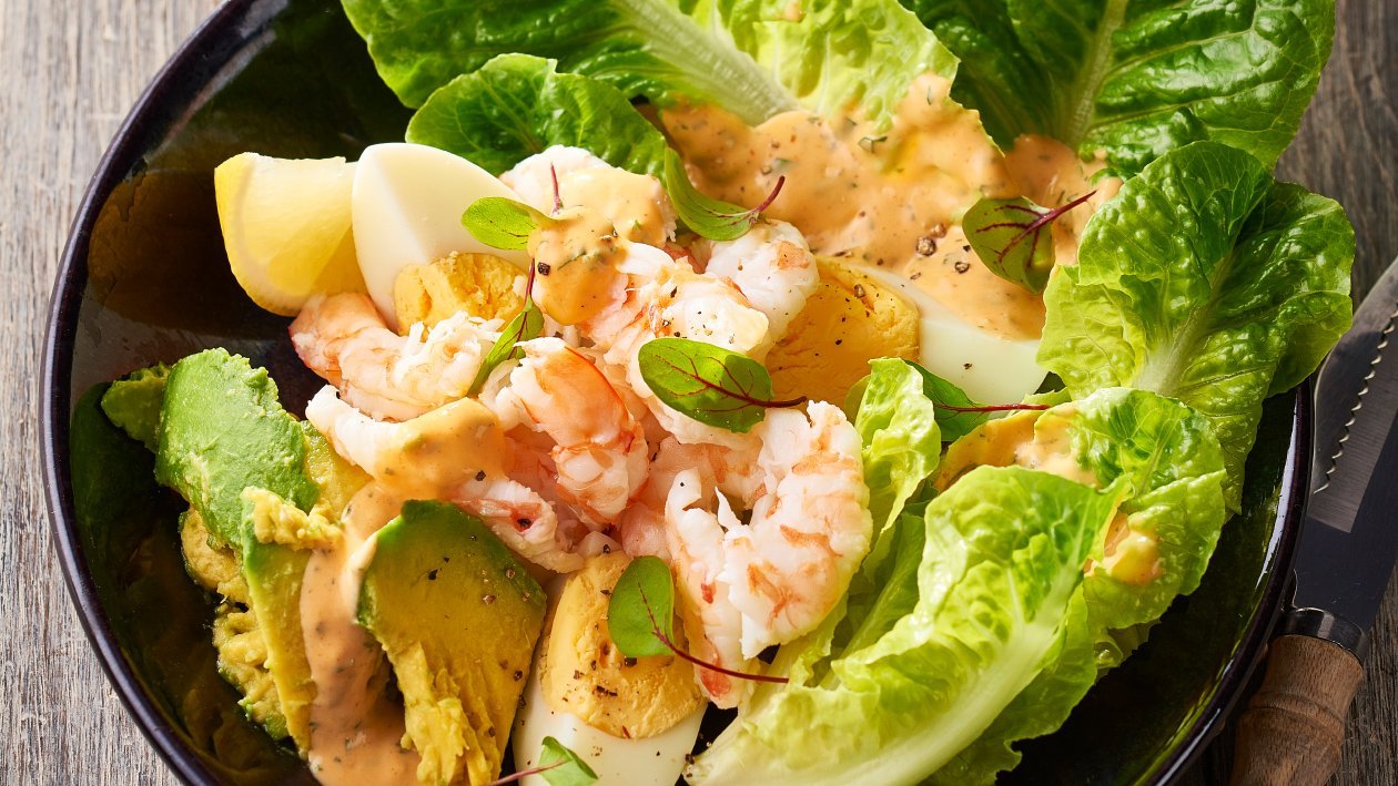 • Colocar os ovos em quartos, o abacate, Hellmann's Molho Mil Ilhas e por cima o camarão e um gomo de limão.