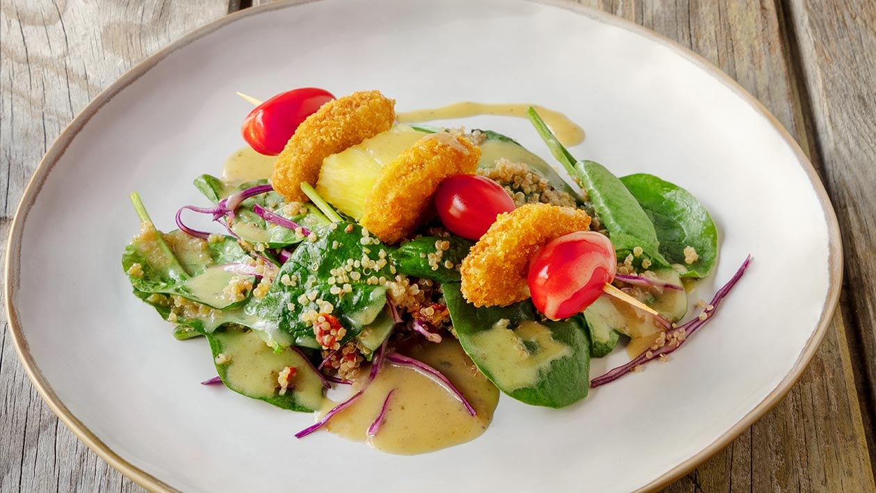 • Servir a salada temperada a acompanhar o espeto crocante.