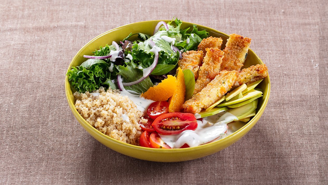 • Colocar as alfaces, a quinoa, o tomate, a pêra abacate e Carteline Hambúrguer vegetal no prato.