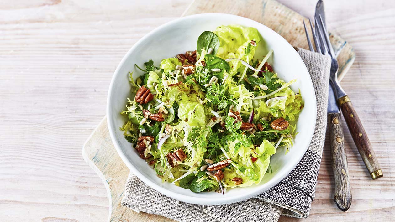 • Finalizar a salada com a cebola roxa, cerefólio, salsa, sementes de girassol, rebentos e nozes pecan.