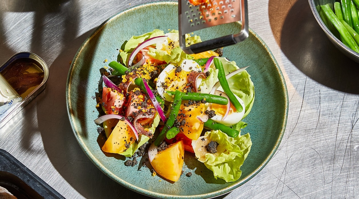 Inspire-se nos Menus do Futuro e faça esta receita de Salada Niçoise com Butarga e Crumble de Azeitona Preta