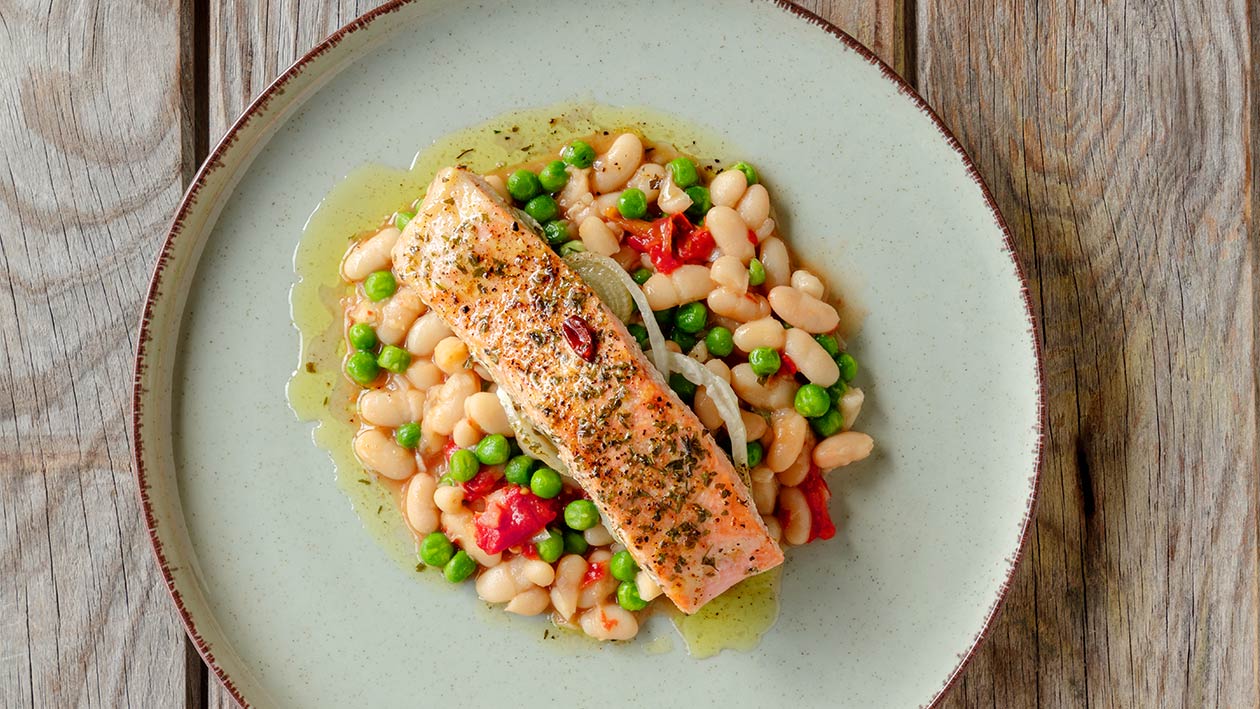 • Servir com o estufado de feijão branco com ervilhas por baixo da tranche de salmão assada.