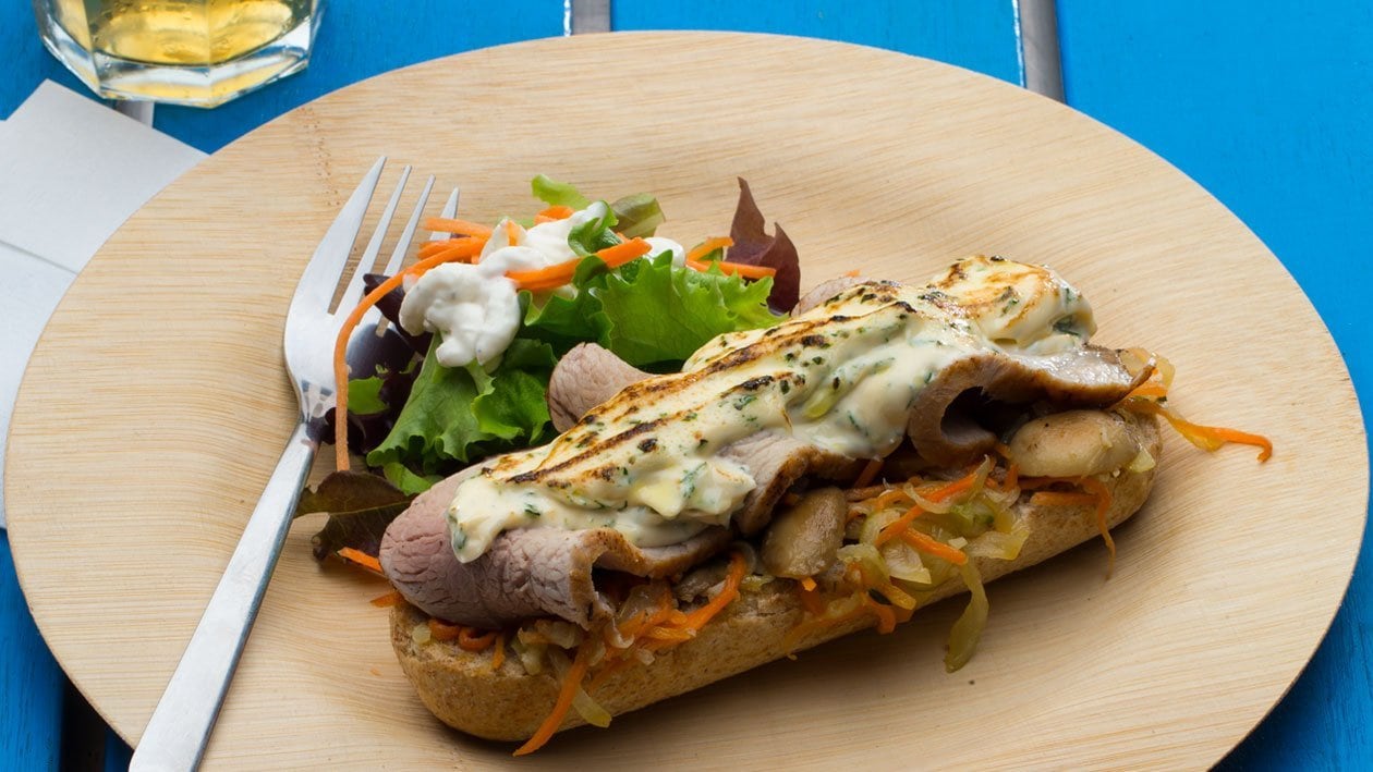 • Colocar o escabeche na base de cada meia baguete, depois a carne assada e por cima o Hellmann's Molho Tártaro.