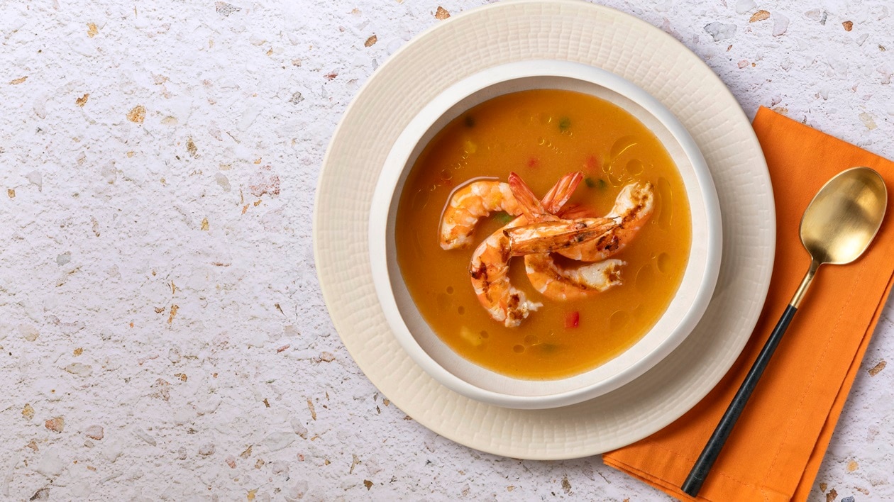 • Verter a sopa fria de camarão e guarnecer com a mistura dos legumes e o camarão grelhado