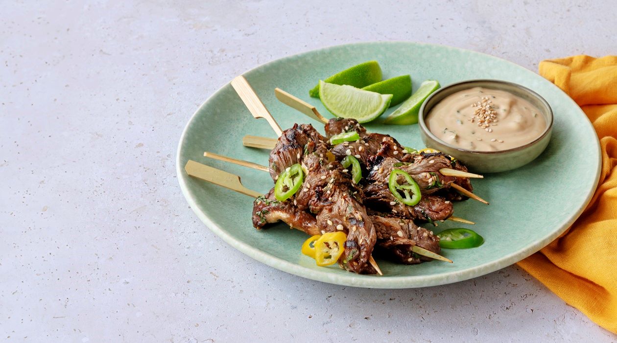 À procura de uma entrada fácil de confecionar? Estas espetadas de novilho são acompanhadas de um delicioso molho asiático.