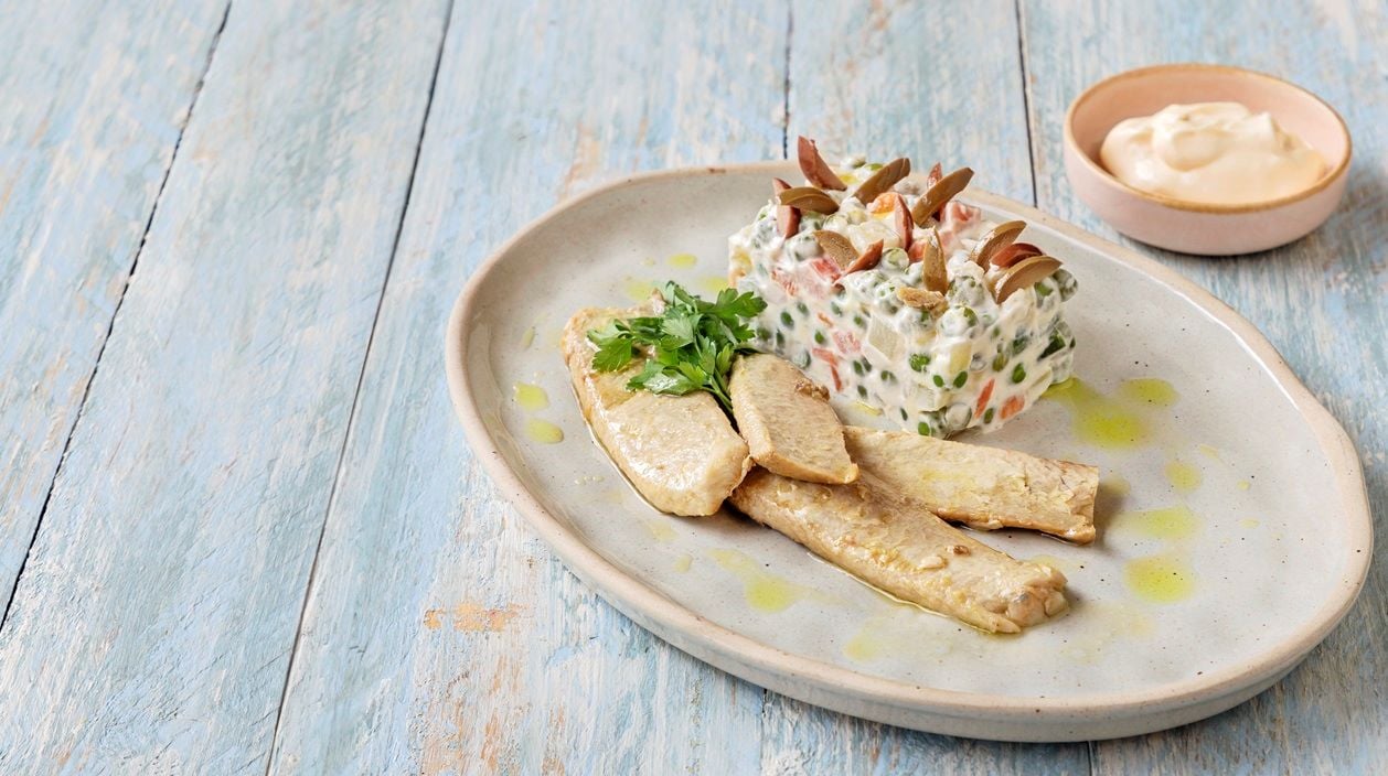 • Enformar a salada russa e servir a ventresca de atum em Azeite Gallo ao lado