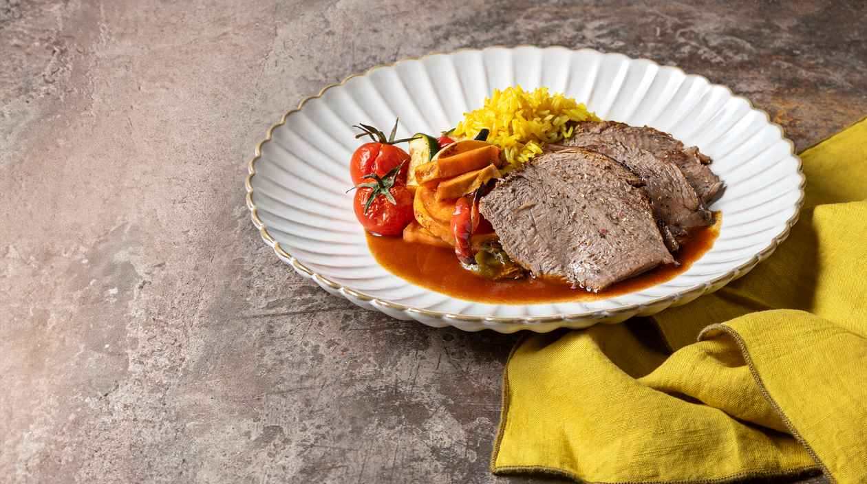 • Servir a carne fatiada, o molho, os legumes assados e por fim o arroz de açafrão.