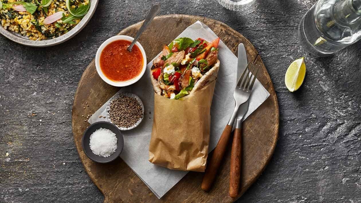 • Num prato, colocar o wrap estendido e recheá-lo com os pedaços de "frango e os restantes ingredientes.